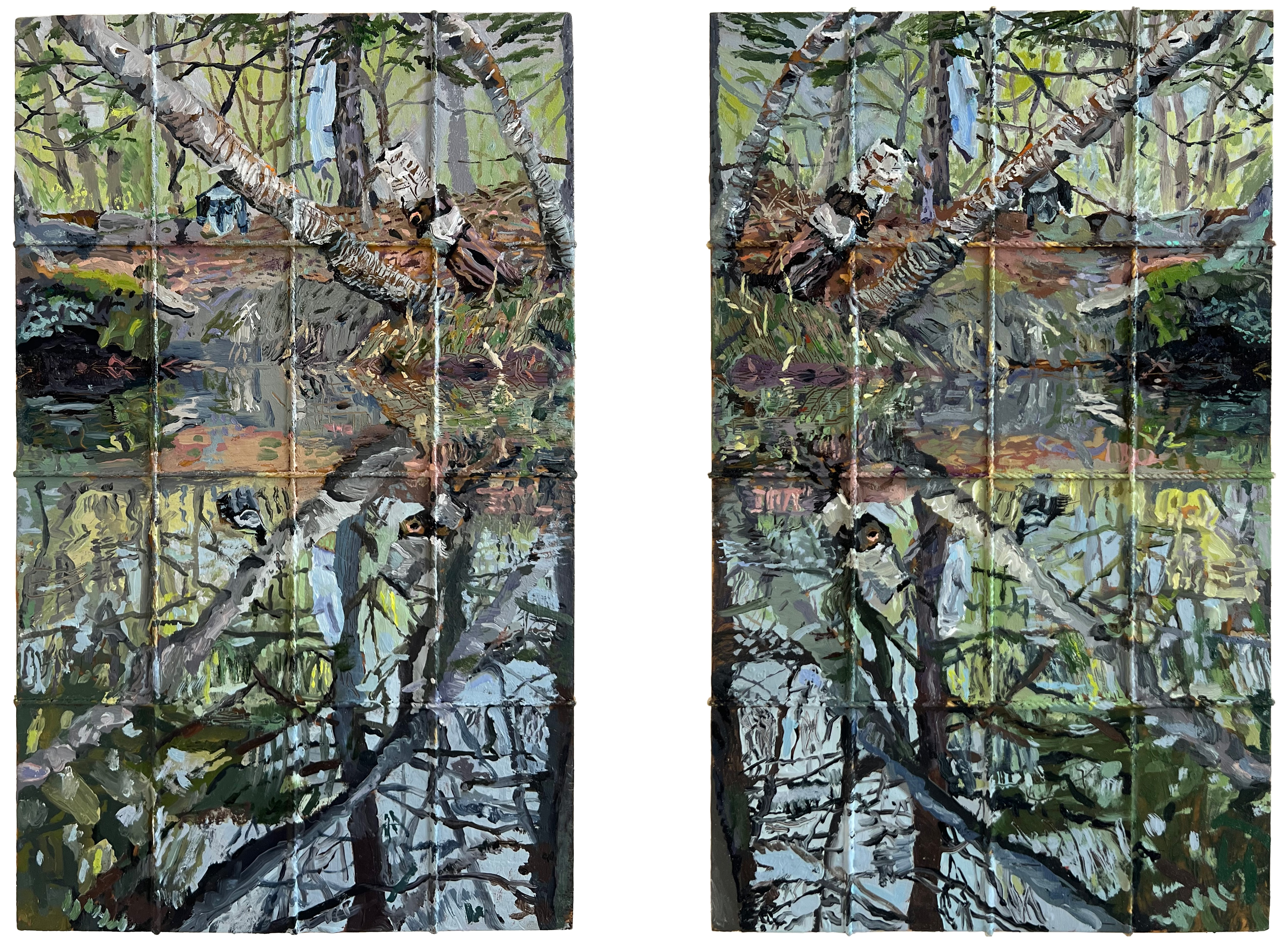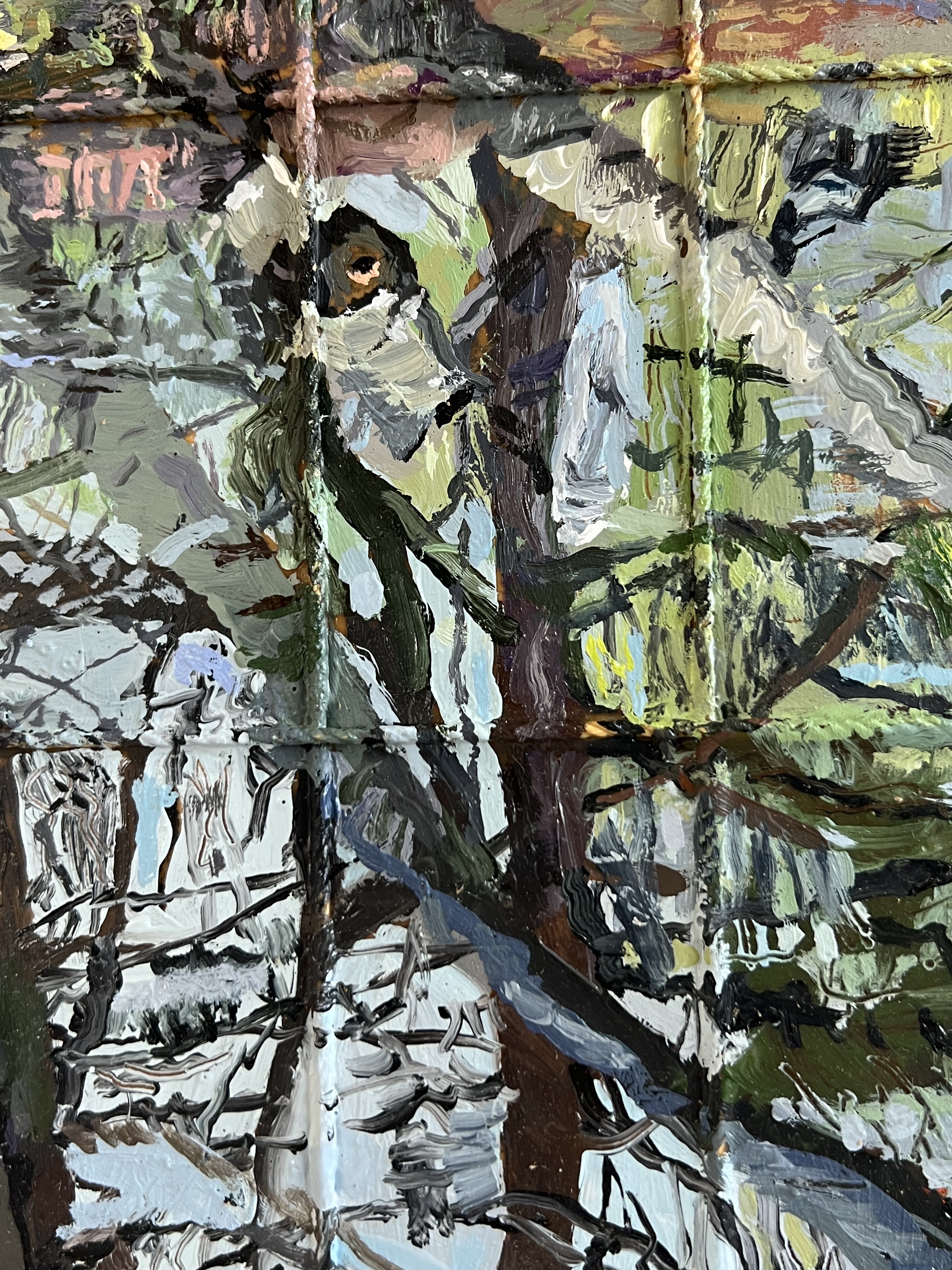 oil paint, PVA, yarn, panel, 20” x 16” 2023.